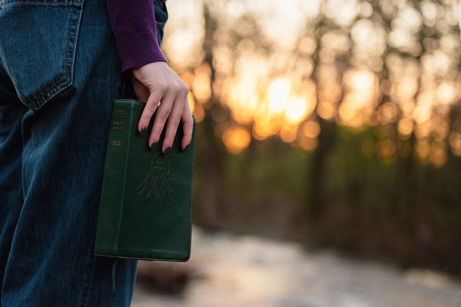 Teenage girl stands in the woods reading a Bible at sunrise.